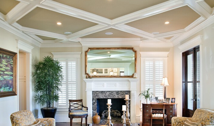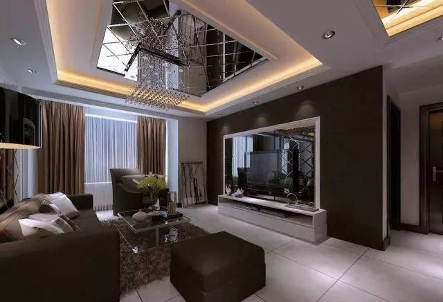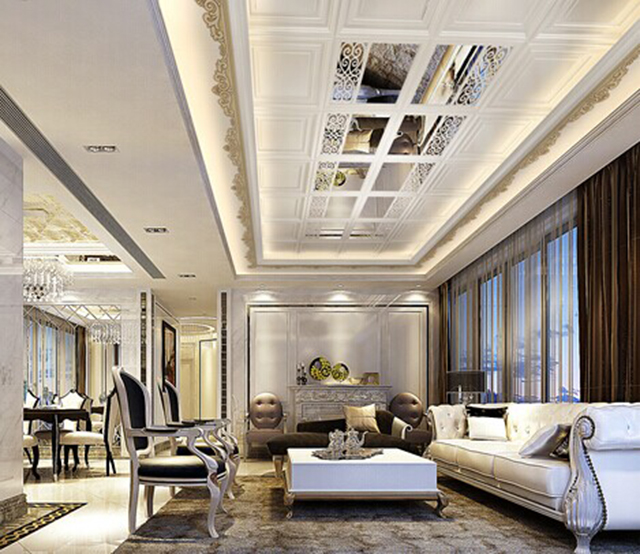 井格式吊頂是利用井字梁因形利導(dǎo)或為了頂面的造型所制作的假格梁的一種吊頂形式。配合燈具以及單層或多種裝飾線條進行裝飾,豐富天花的造型或?qū)邮疫M行合理分區(qū)。