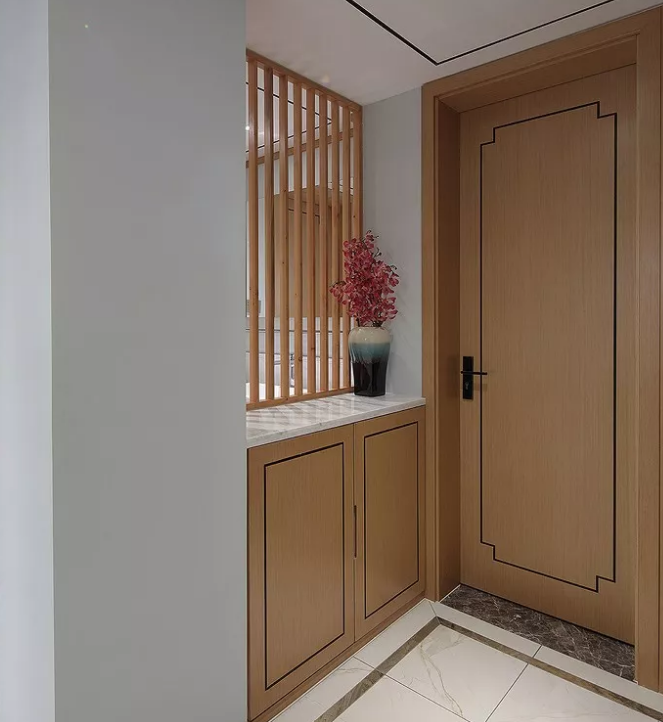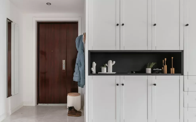 嵌入式鞋柜一般是和進門吊頂結合設計的,不僅美觀實用而且可以大大節(jié)省室內(nèi)空間。利用墻面的空間,在考慮墻體的承重范圍下,在玄關處設計嵌入式鞋柜,能夠保證鞋柜足夠安全。