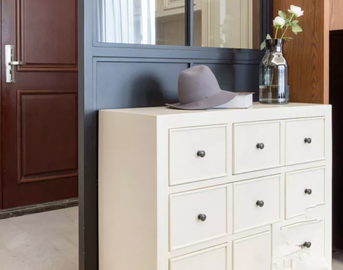這樣中間和柜底懸空的設計,中間放綠植、相框、鑰匙、零錢的,底部放常穿的鞋子,其他封閉起來的柜子都可以當做收納柜。