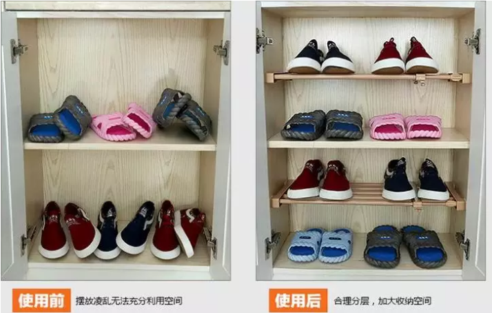 可調節(jié)層板的實現(xiàn)方式有很多種,小編最推薦的是使用伸縮桿,一層變兩層,高度可以根據(jù)鞋幫高度來調整。