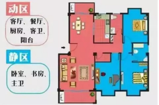 所謂“動(dòng)靜分離”,就是把動(dòng)區(qū)(客廳、廚房、餐廳等)跟靜區(qū)(臥室、書房等)通過合理的空間布局給分離開來,在動(dòng)區(qū)的活動(dòng)保持的基礎(chǔ)下,又能讓靜區(qū)能夠保持一定的私密性,減少彼此之間的干擾。