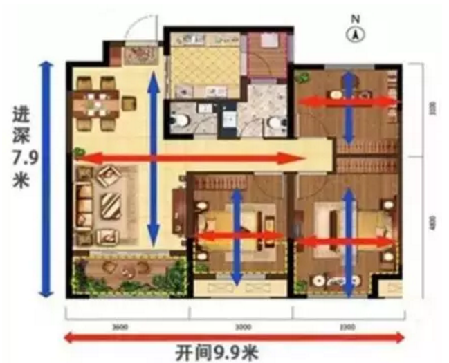 把房子的主要采光面稱為開間(一般指東西的距離),與其垂直的稱為進(jìn)深(一般指南北的距離)。開間和進(jìn)深的比例為4:6較為合適,如果開間太小,進(jìn)深過大,會(huì)影響房子的采光,反之則室內(nèi)溫度,濕度不穩(wěn)。