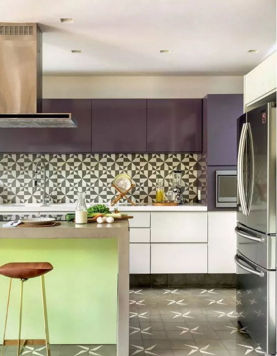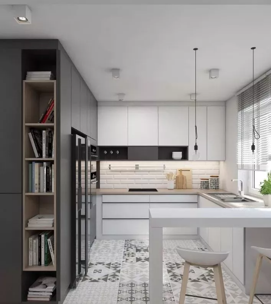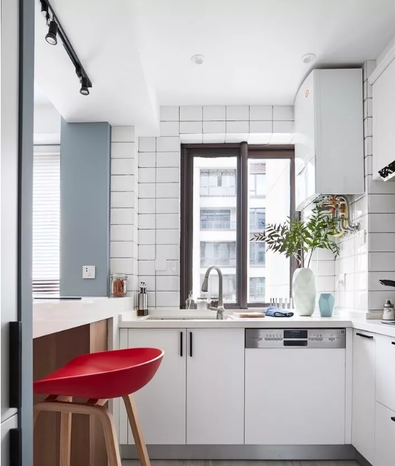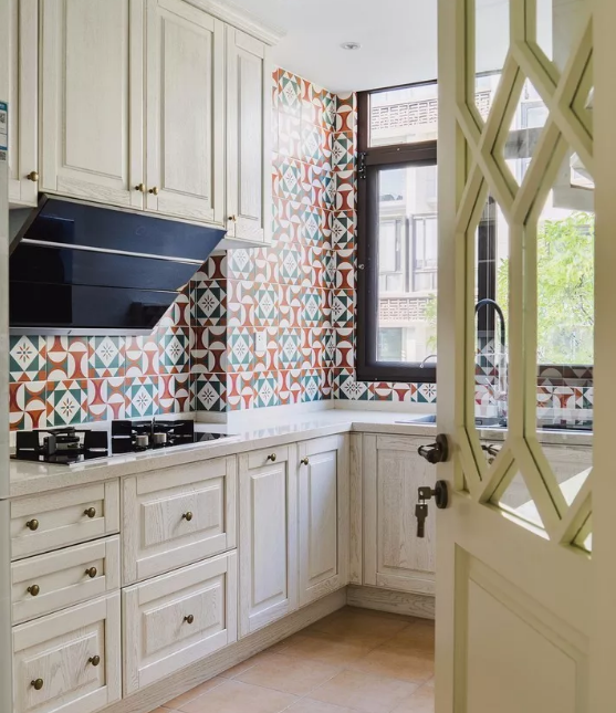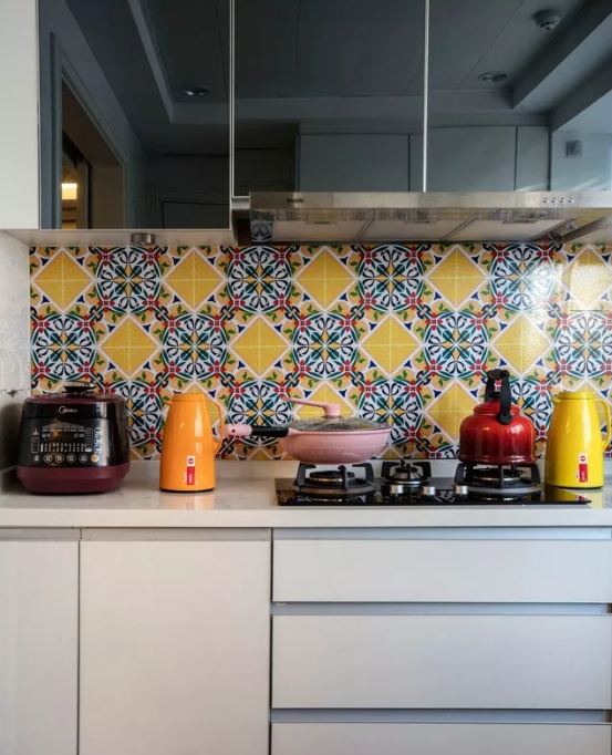 廚房的墻面一般比較單調(diào),實用性遠遠勝過了裝飾性,因而沒有太大的亮點。如果用花磚進行裝飾,和其他單色磚形成一個視覺上的對比,或許就能輕松打造視覺焦點了。
