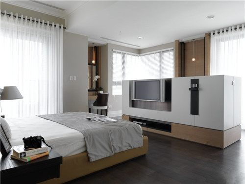 臥室、洗手間一柜分離:在打造主臥過程中,如何能更大利用空間?比起裝一道門來分隔衣帽間和臥室,用兩扇柜子門是不是更簡單?現(xiàn)在是打開的,合上就會變成一道門。