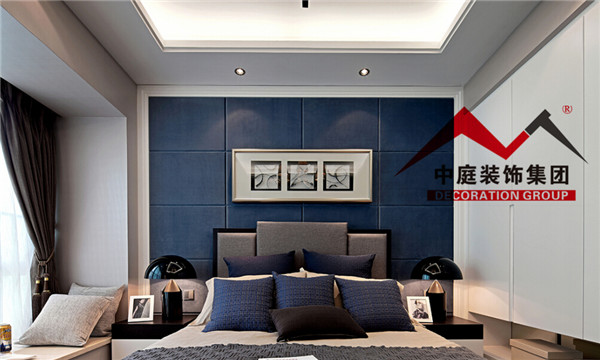 床頭采用深藍色做背景墻,與床上用品的顏色相結合。