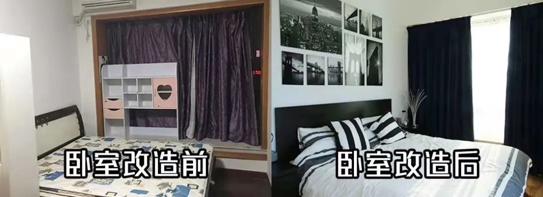 經(jīng)過改造后,擴(kuò)大了臥室的空間,兩邊都有床頭柜,窗簾前置,設(shè)在飄窗里面,能夠完全遮擋住墻邊。地板換成淺木紋地板,奠定了輕松舒適的氛圍。