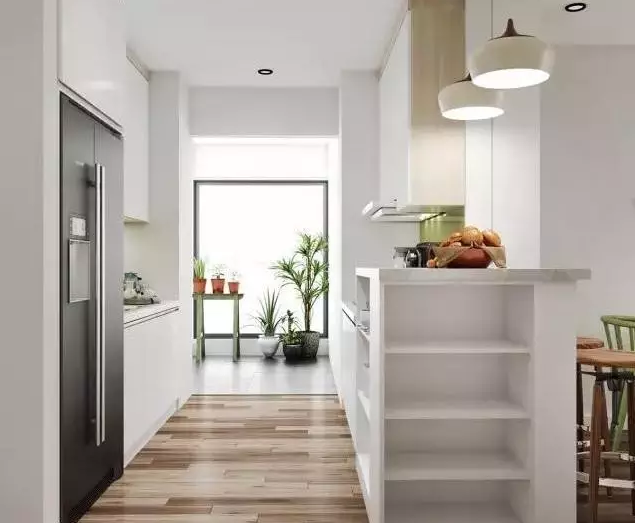 廚房以白色為主,將一部分的空間留白,平衡了整體效果。現(xiàn)代化的廚房不僅擁有高顏值,更加突出功能性與存儲性。