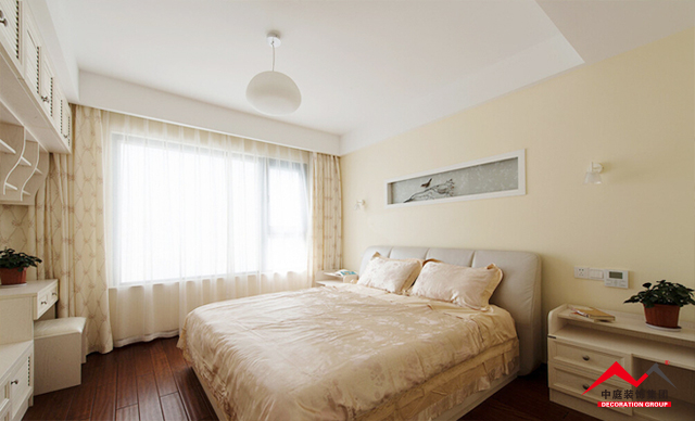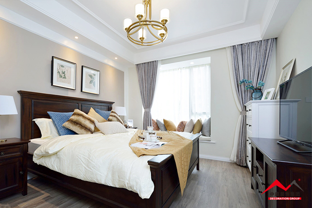 c、臥室的床品也是一個很好的參照物,歐式風格的床品搭配歐式的窗簾。比如上圖,窗簾以米色花卉與淺咖色葉子相間,與織花床品完美融合。
