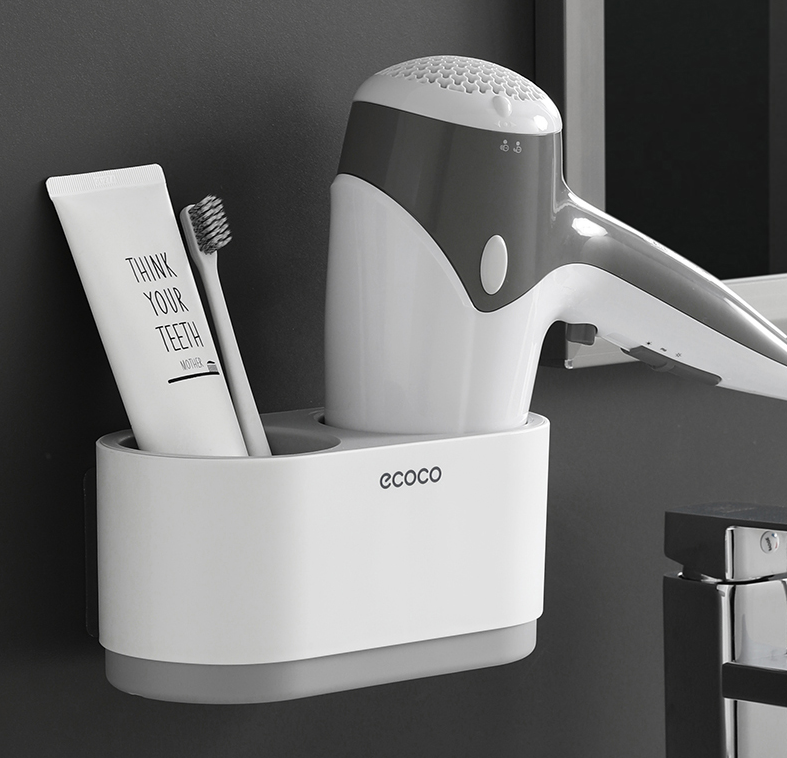 有兩個收納筒,一邊可以放梳子、剃須刀等,另一邊就放吹風筒啦,風嘴小于8cm的吹風筒都合適,掛墻上不占地兒。
