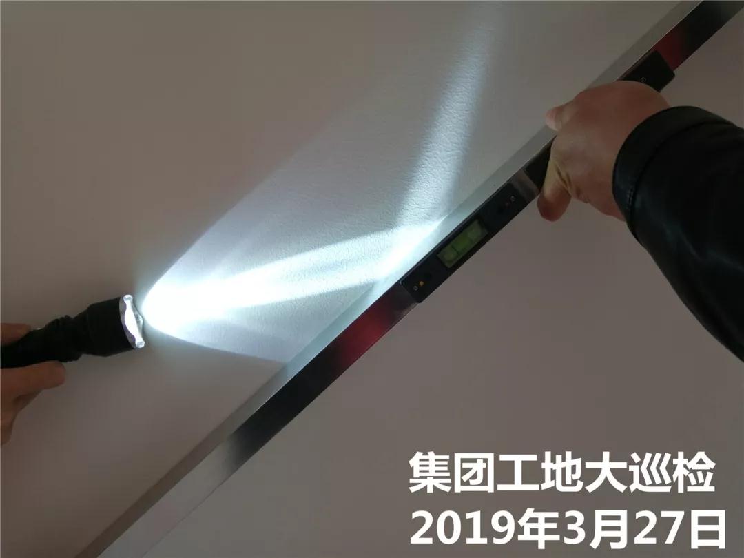 用靠尺和強光手電筒檢查墻面施工平整度,手電筒強光未能穿透墻面與靠尺間的縫隙,達到集團要求施工標(biāo)準(zhǔn)。