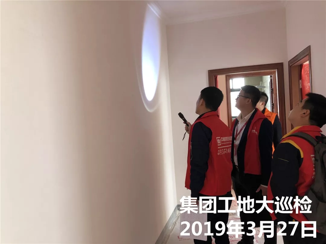 運營部成云總經(jīng)理與張立安總經(jīng)理用強光手電筒檢查墻面膩子施工