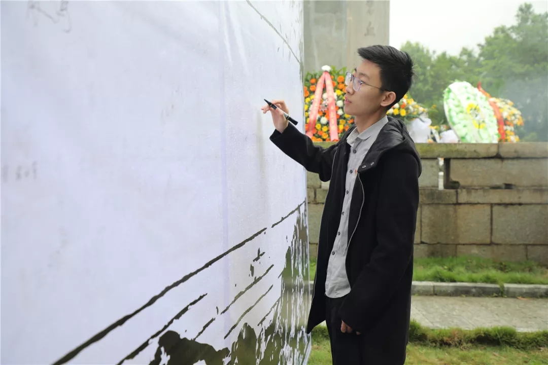 ▲黨支部代表陳夢浩在烈士塔紀(jì)念墻簽字留念