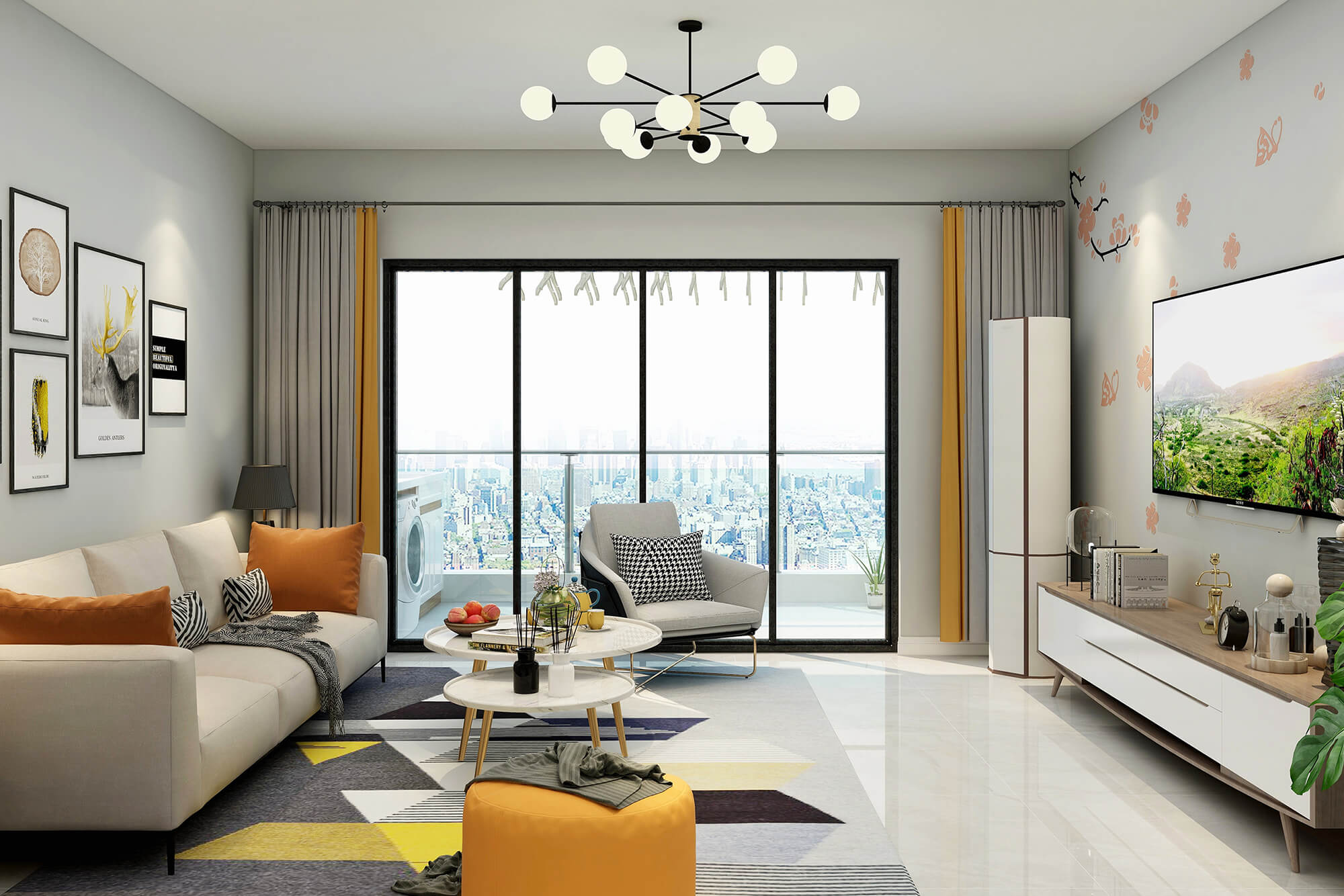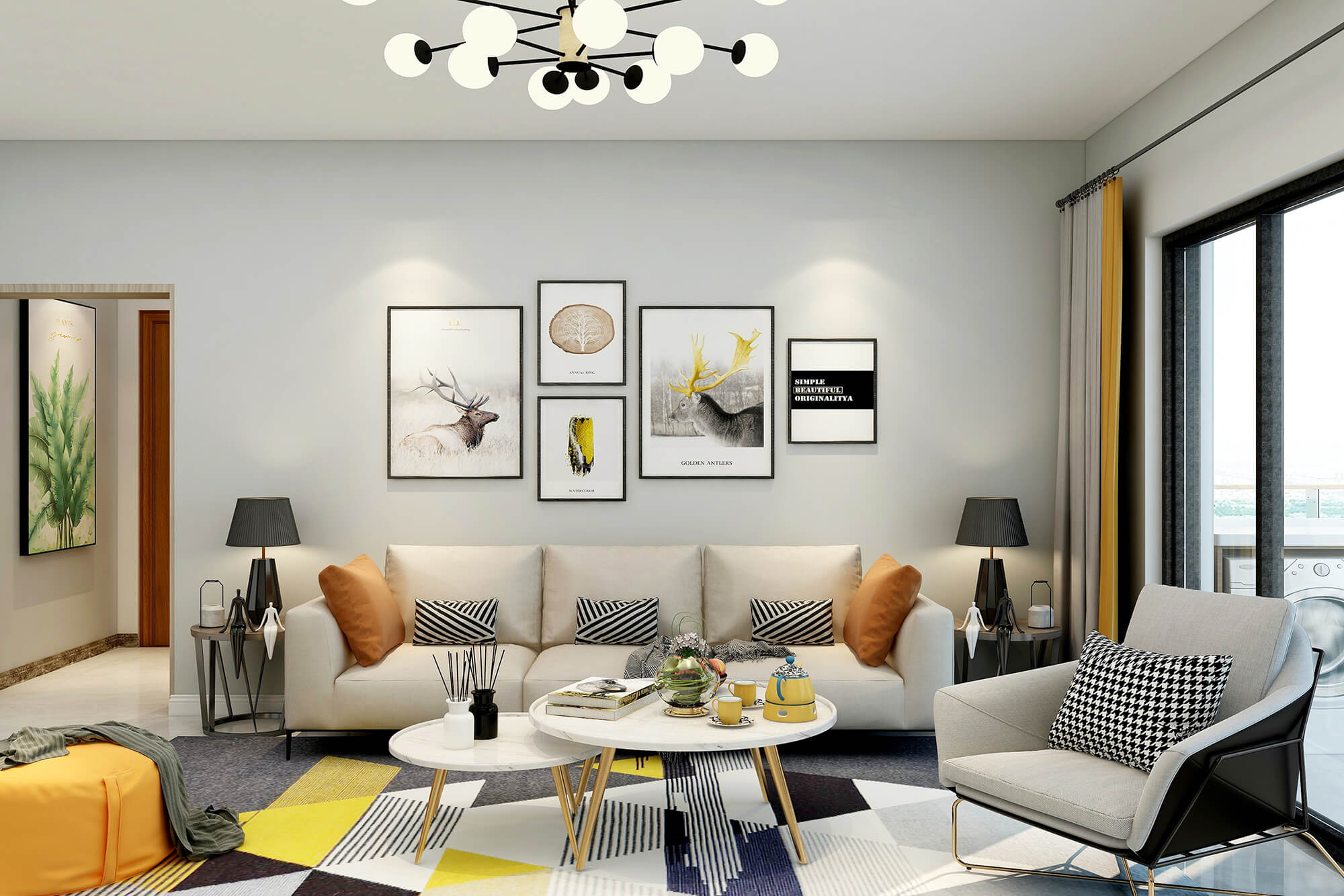 白色與米白色的搭配看起來干凈又溫柔,加上地毯里一抹明黃的顏色與沙發(fā)的橙色抱枕和橙色圓凳的跳色讓溫柔的搭配里又多了絲活潑,加上綠植點綴更好的融合了整體空間的色彩搭配。