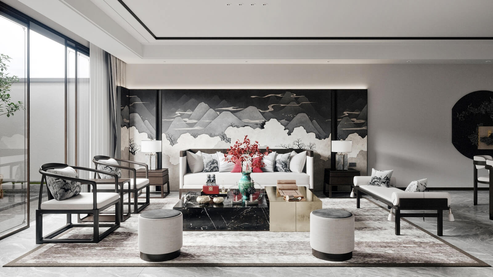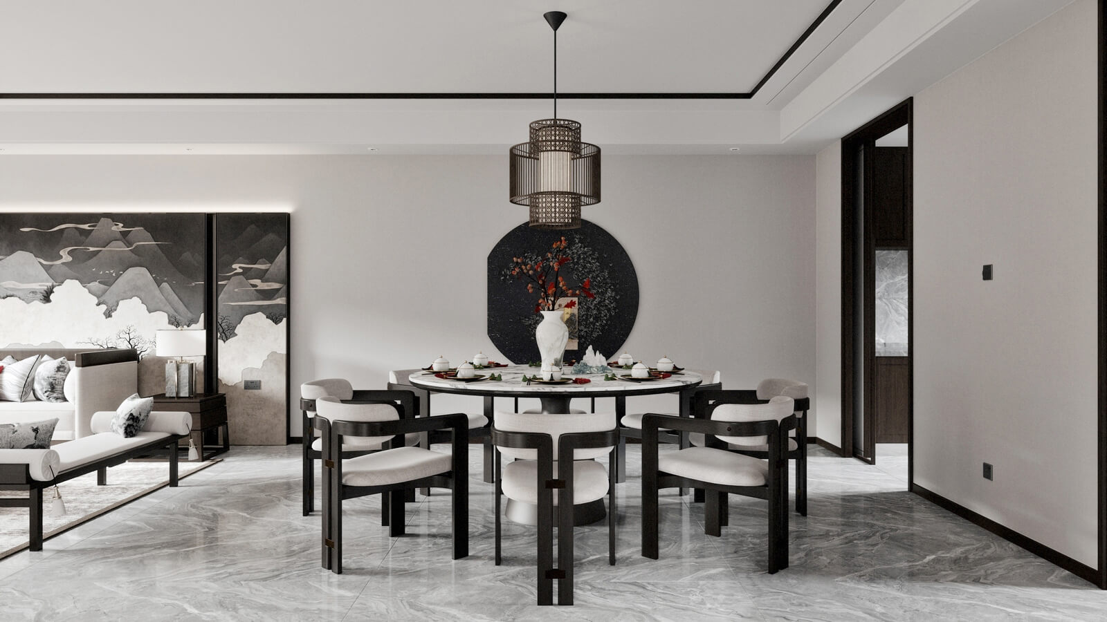瀏覽量:1147設(shè)計師打破了人們對傳統(tǒng)中式風(fēng)格的固有觀念,加入了許多現(xiàn)代化的設(shè)計元素。其中,中國風(fēng)味一點兒也沒少。山水畫,瓷器,深色桌椅,這些富含古典韻味的裝飾,完美地與現(xiàn)代化的空間融為一體,體現(xiàn)出靜謐的美感。