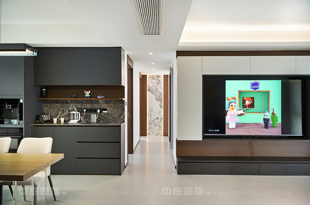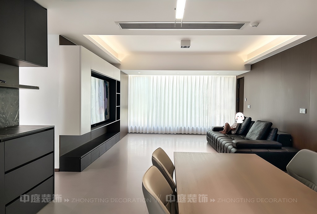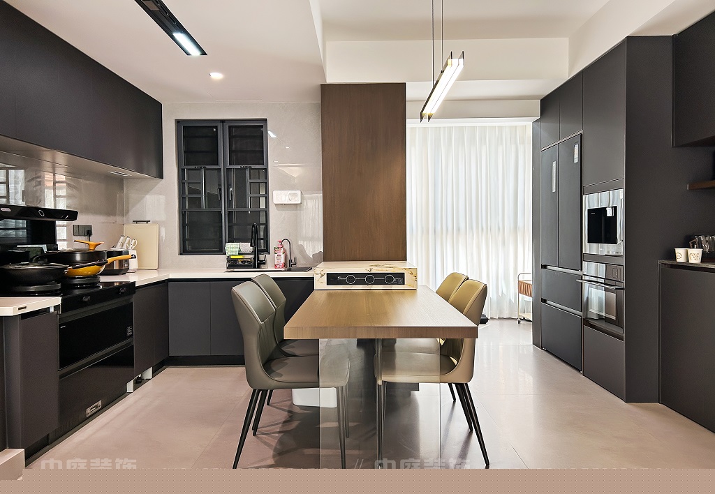 瀏覽量:86客廳以現(xiàn)代黑白灰極簡風格為核心,大面積白紗簾引入自然光線,黑色皮質沙發(fā)質感高級。開放式布局,深灰櫥柜與木質餐桌形成材質對比,線性吊燈提升精致感,功能與美學兼具,營造現(xiàn)代簡約的烹飪用餐氛圍。輕柔窗簾與柔和燈光,打造靜謐休息空間。精致的材質選擇與合理的功能規(guī)劃,詮釋了“少即是多”的現(xiàn)代簡約居住美學。