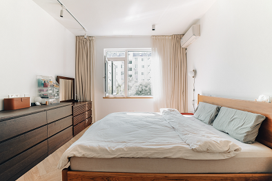 主臥整體用色與風格延續(xù)整體原木色系,木地板配木色家具,色調素雅,加上簡潔而現(xiàn)代的軟裝陳設,白色的棉麻窗簾讓室內的氣氛柔和而溫馨